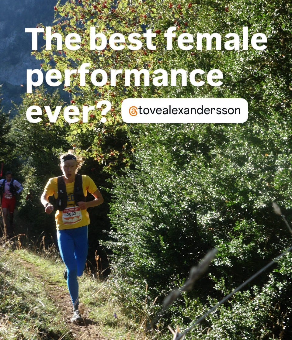Tove Alexandersson - An unbelievable run at the World Trail Champs and I believe it might be the highest ever ITRA score. I was there to witness it and I couldn’t quite believe what I was seeing. She wasn’t just tearing up the women’s field, she was tearing up the men’s as well!!